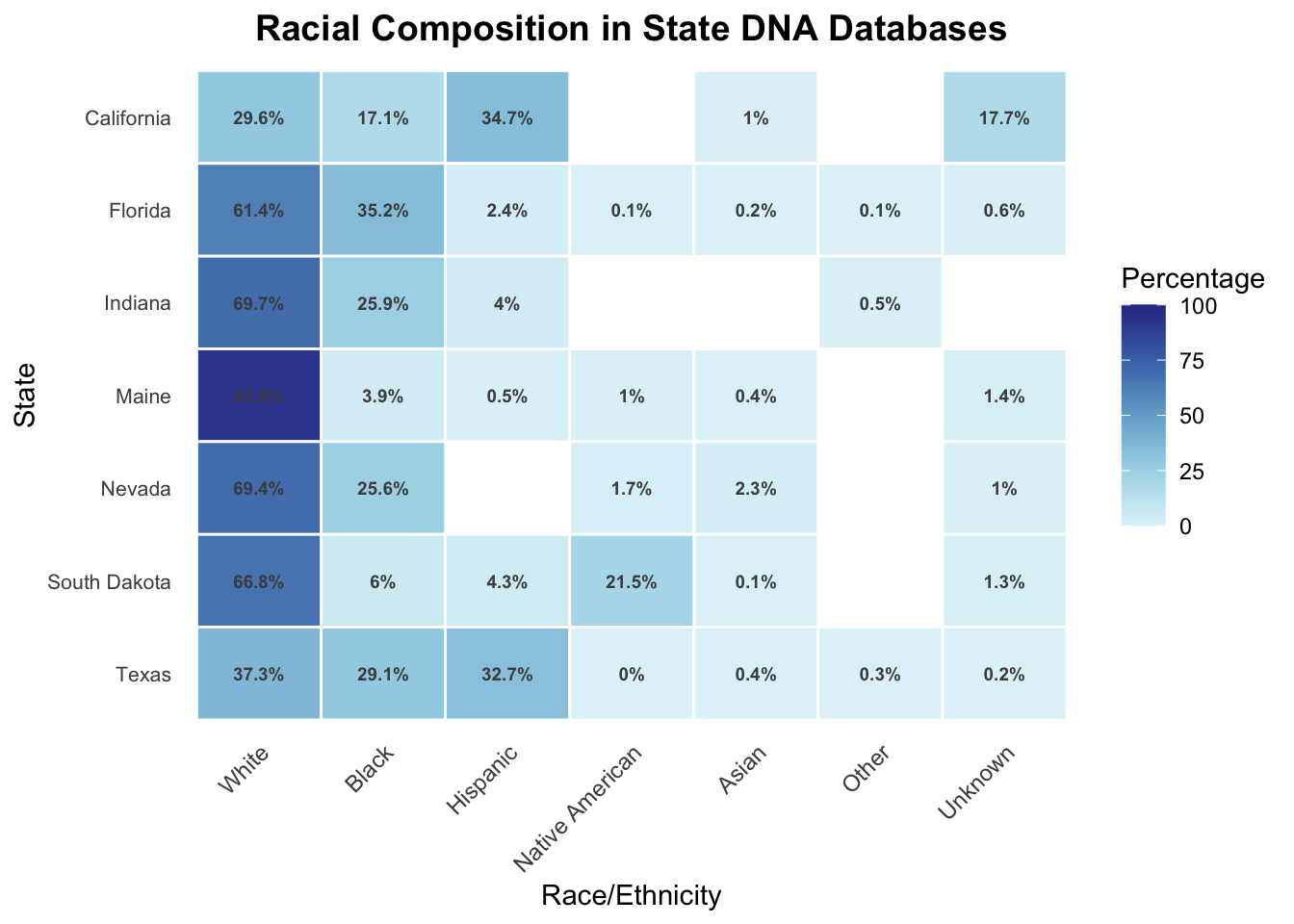 This document details the processing of Freedom of Information Act (FOIA) responses from seven U.S. states regarding the demographic composition of their State DNA Index System (SDIS) databases. These responses were obtained by Professor Erin Murphy (NYU Law) in 2018 as part of research on racial disparities in DNA databases.