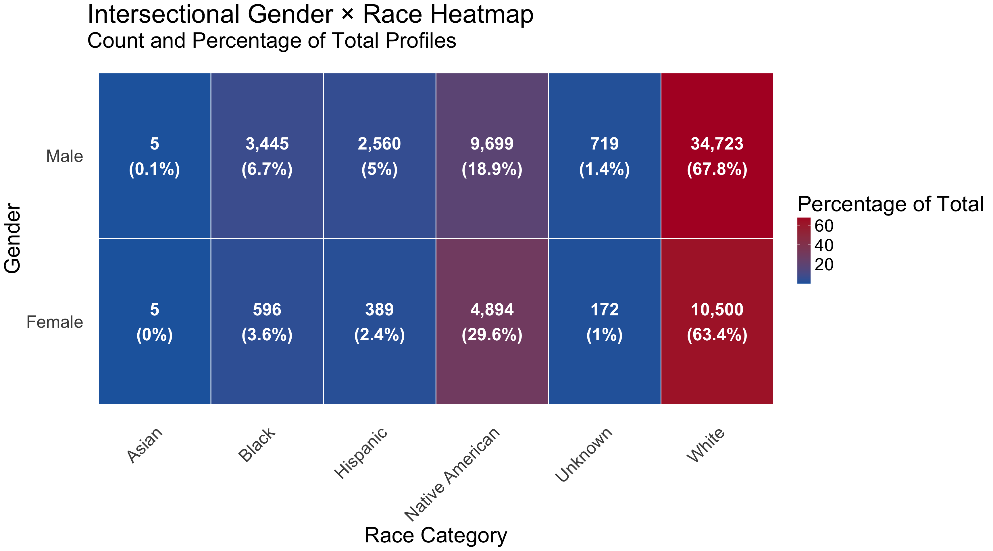 ✅ Comprehensive reporting: Standard demographics plus unique gender×race intersectional data