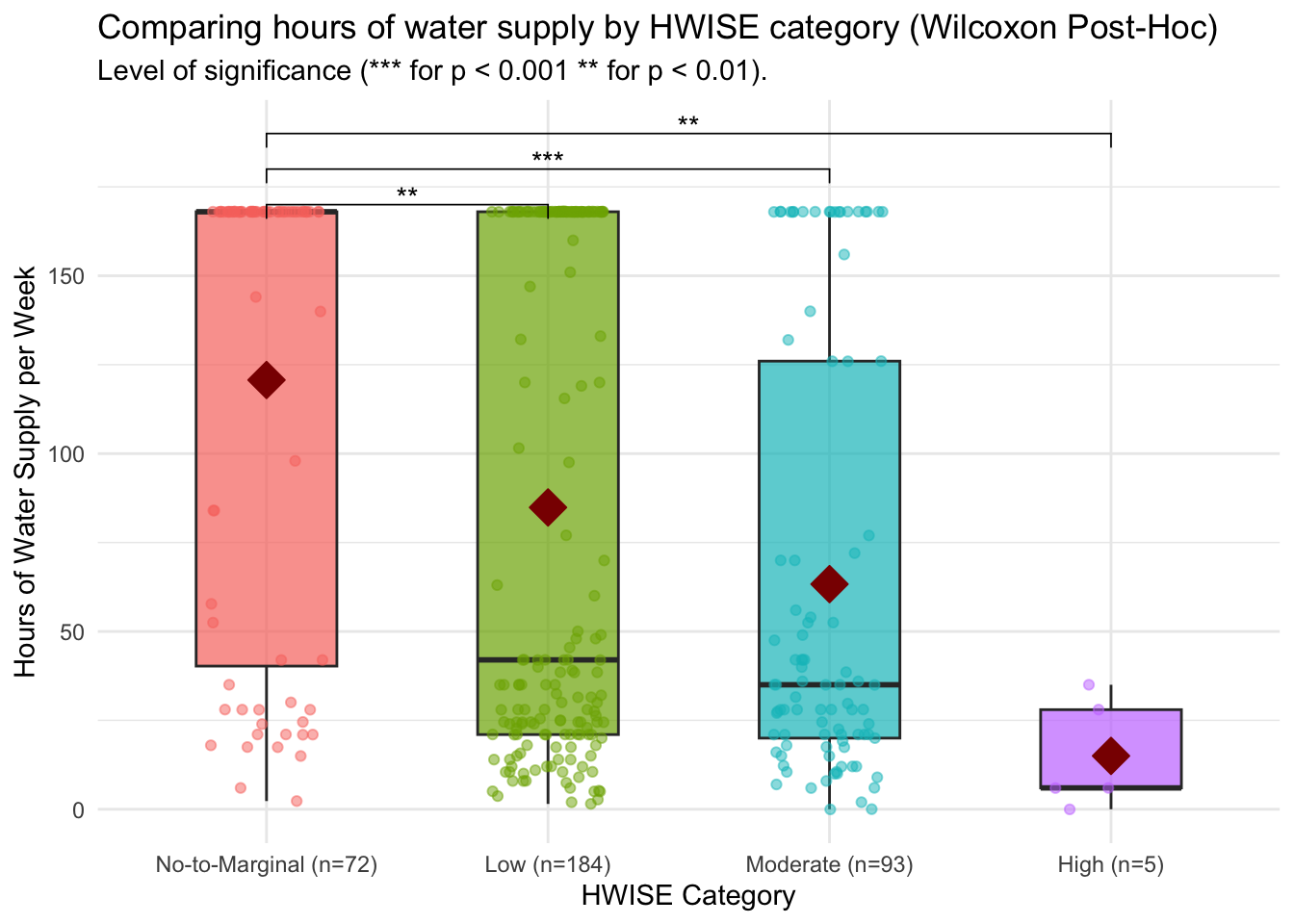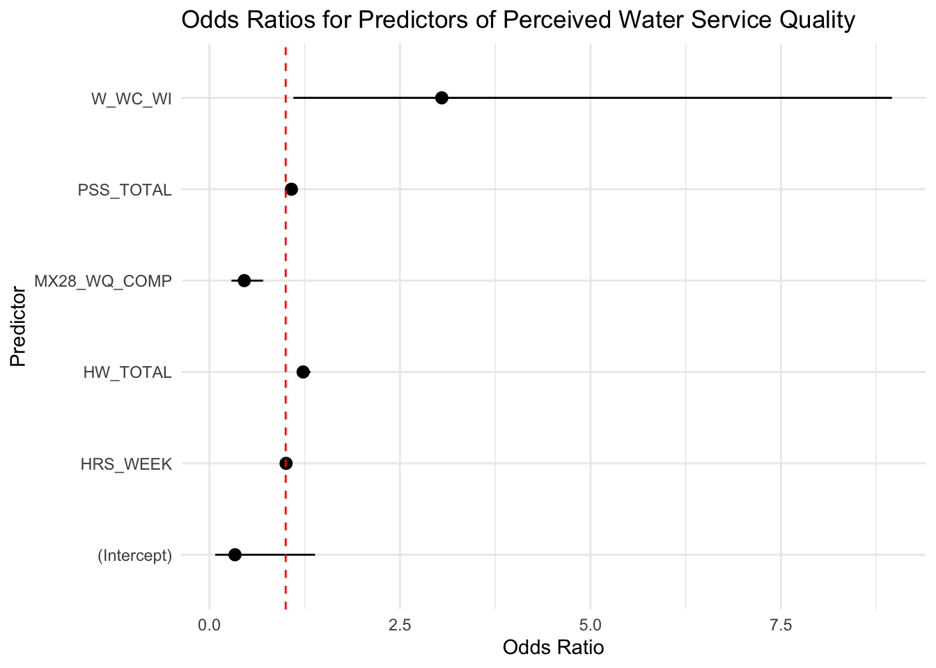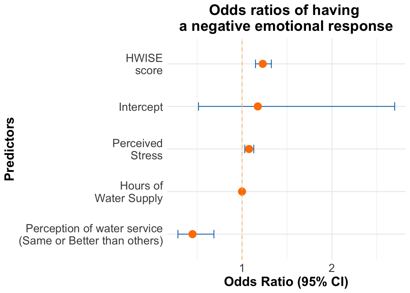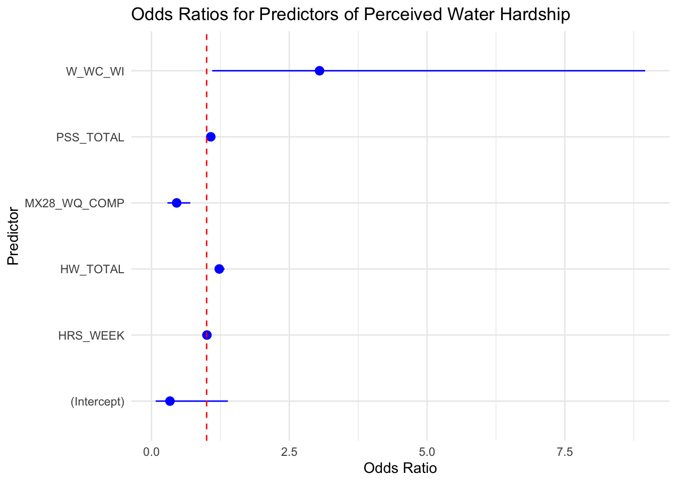 Variable Odds Ratio (OR) Interpretation HW_TOTAL 1.230 Higher water insecurity → More negative emotions (23% increase per unit). PSS_TOTAL 1.078 More stress → More negative emotions (7.8% increase per unit). MX28_WQ_COMP 0.449 Better perceived water service → Lower odds of negative emotion (55.1% lower odds per unit). HRS_WEEK 0.9996 Water availability (hours) has no significant effect on emotion.
