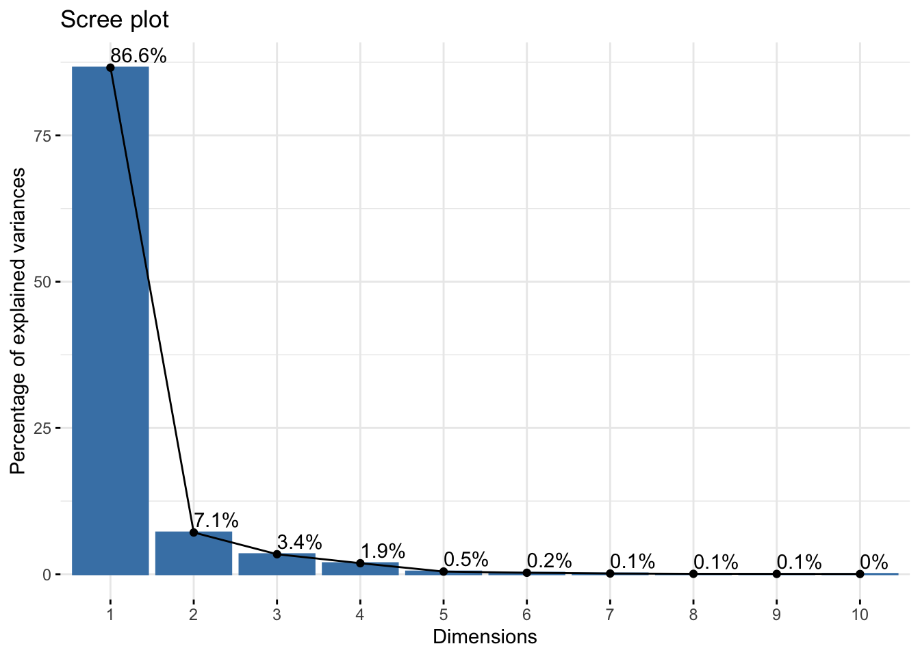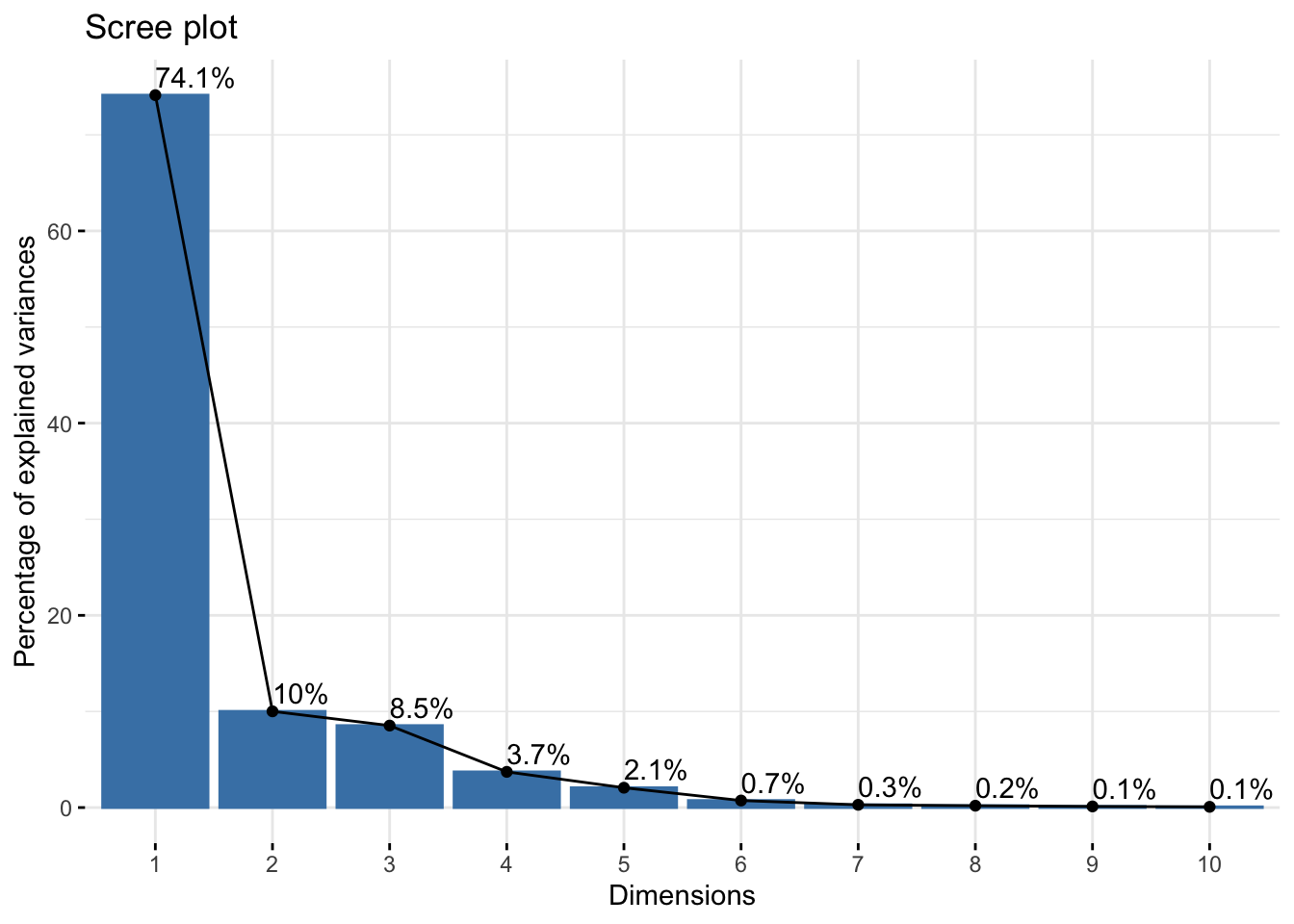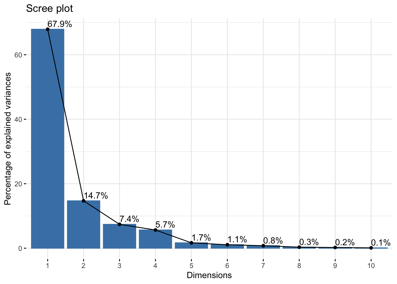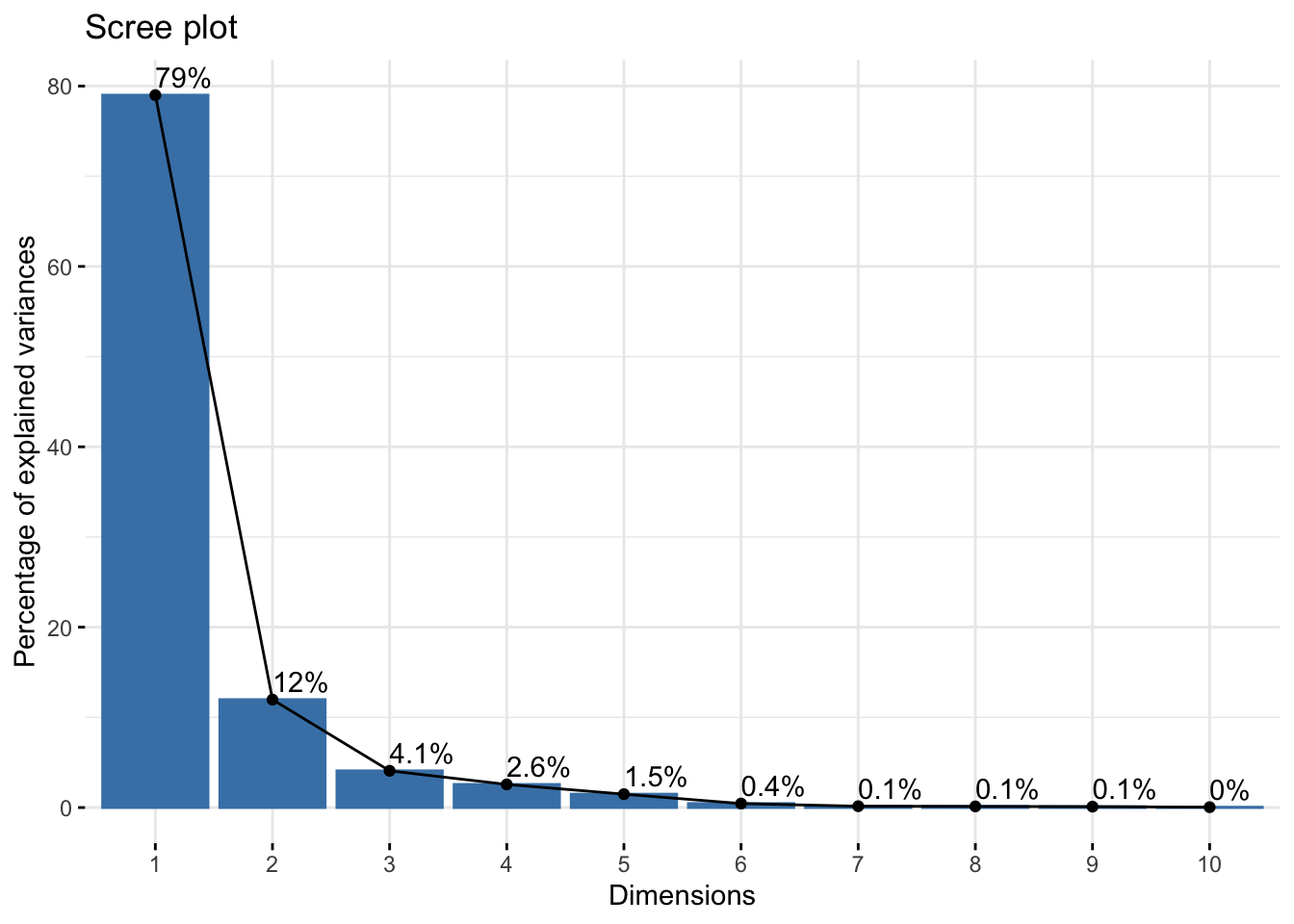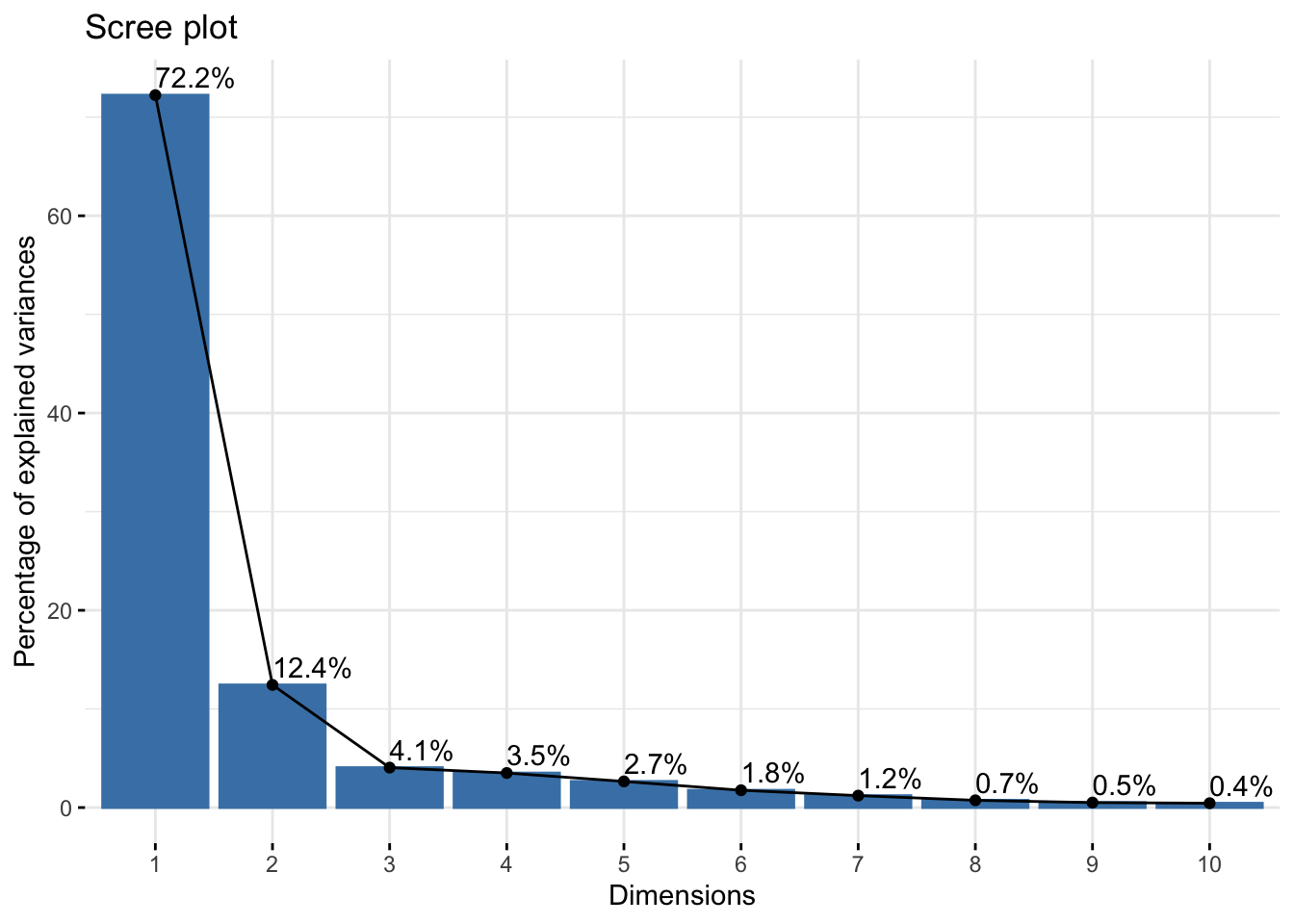 fviz_eig(summer_cie_pca, addlabels = TRUE)