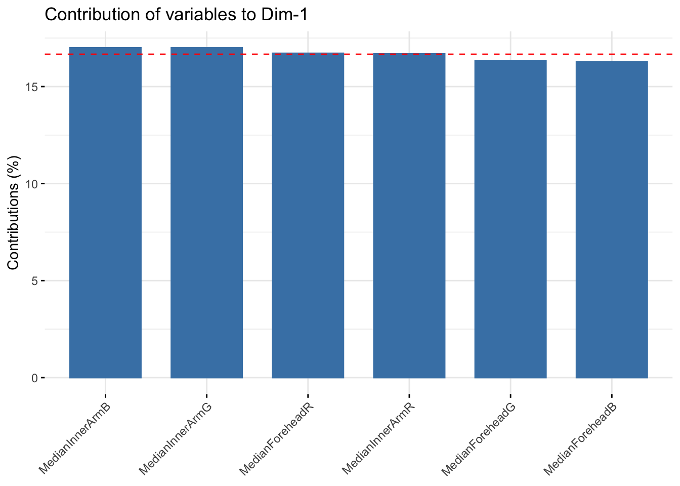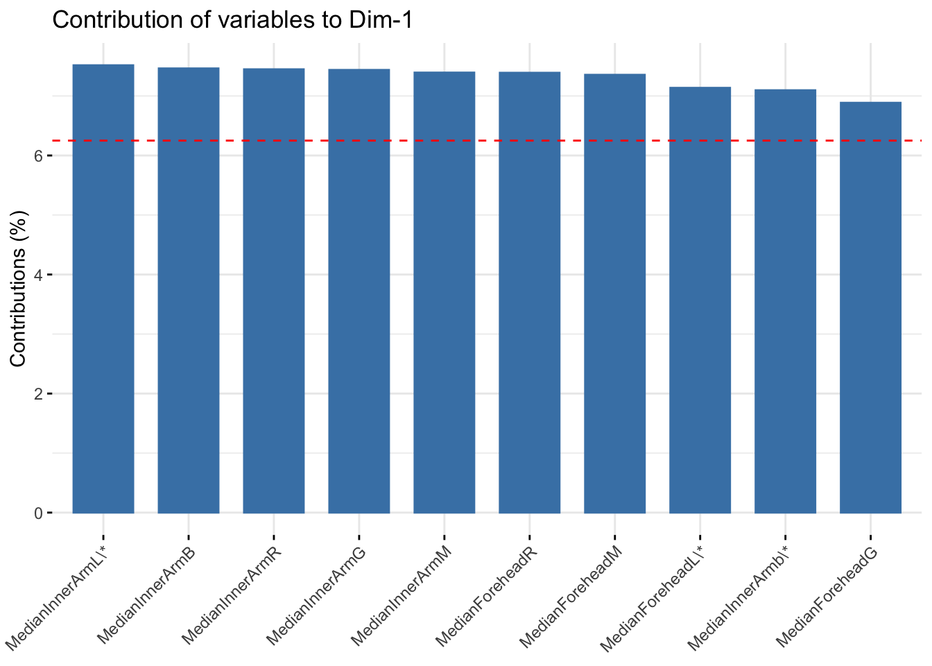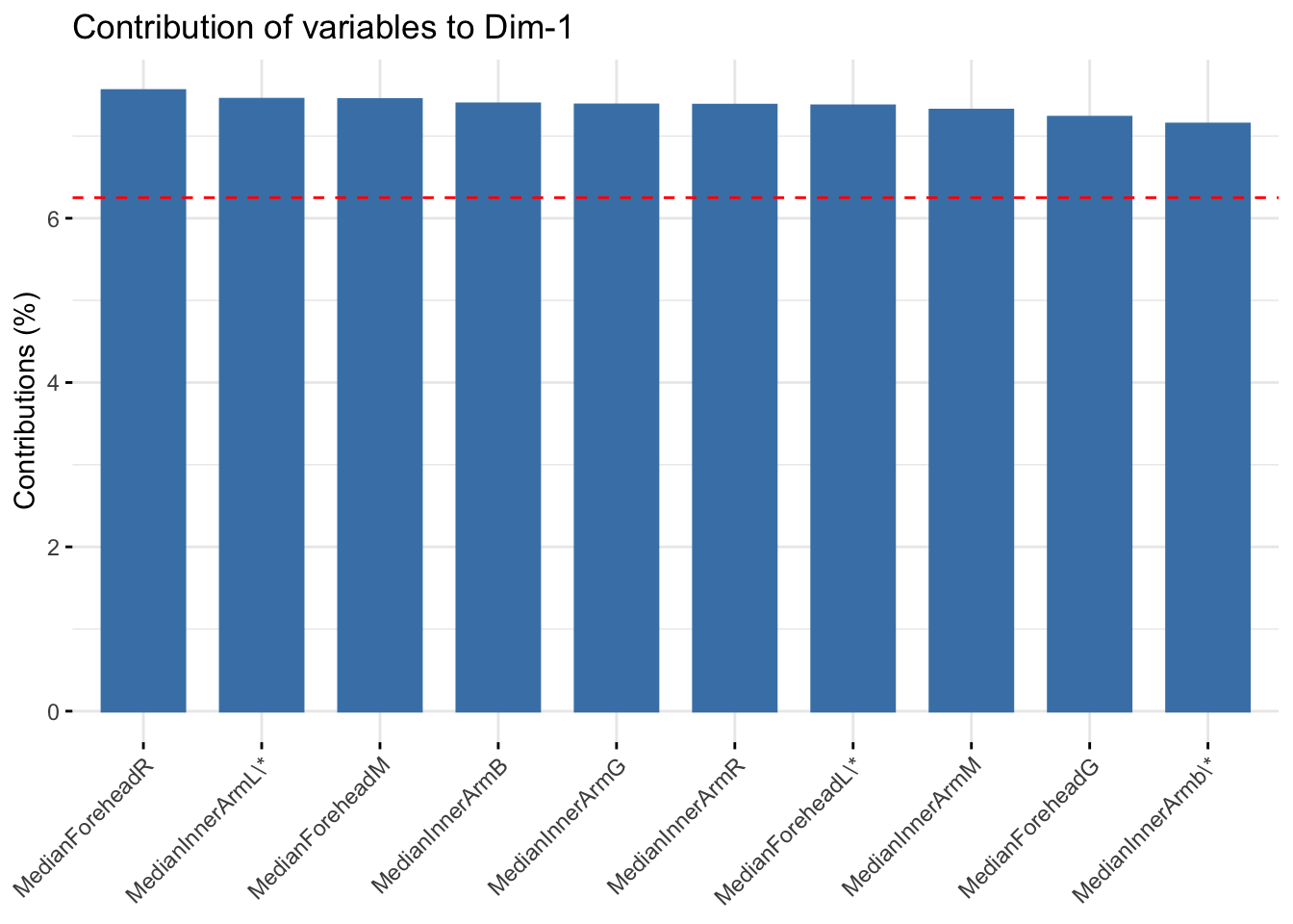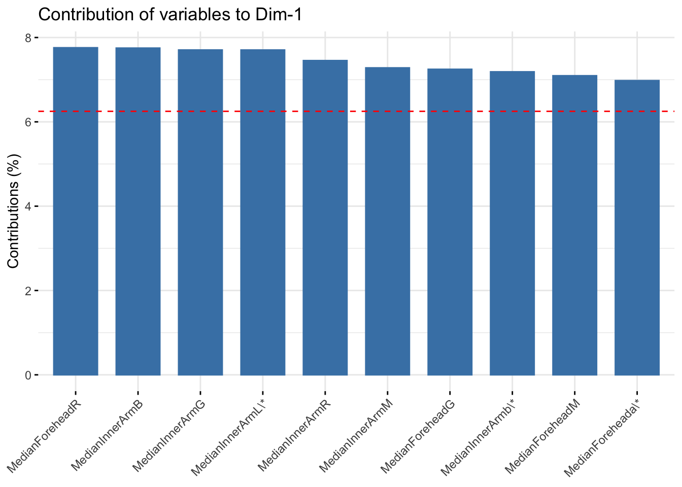 fviz_contrib(six_cie_pca, choice = "var", axes = 1, top = 10)