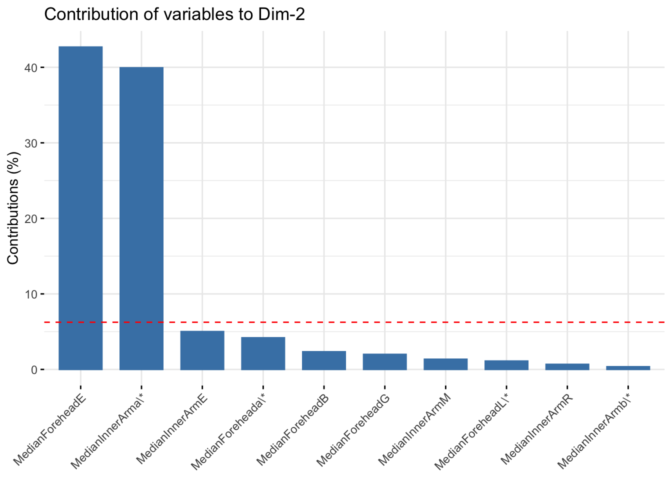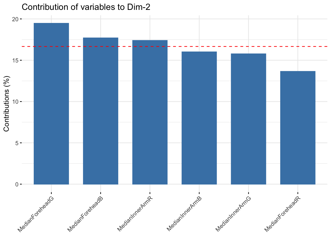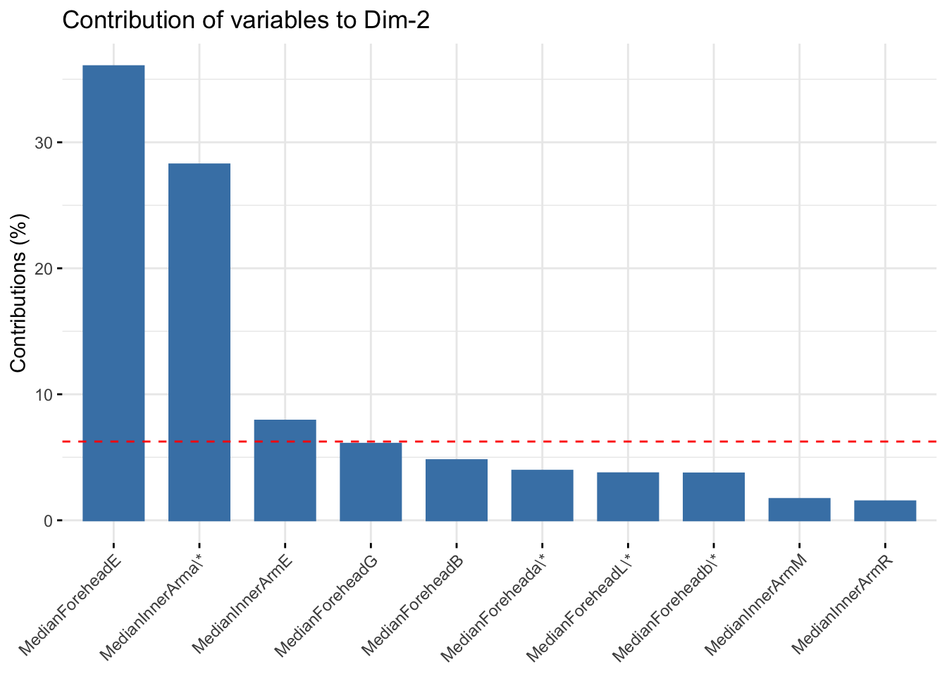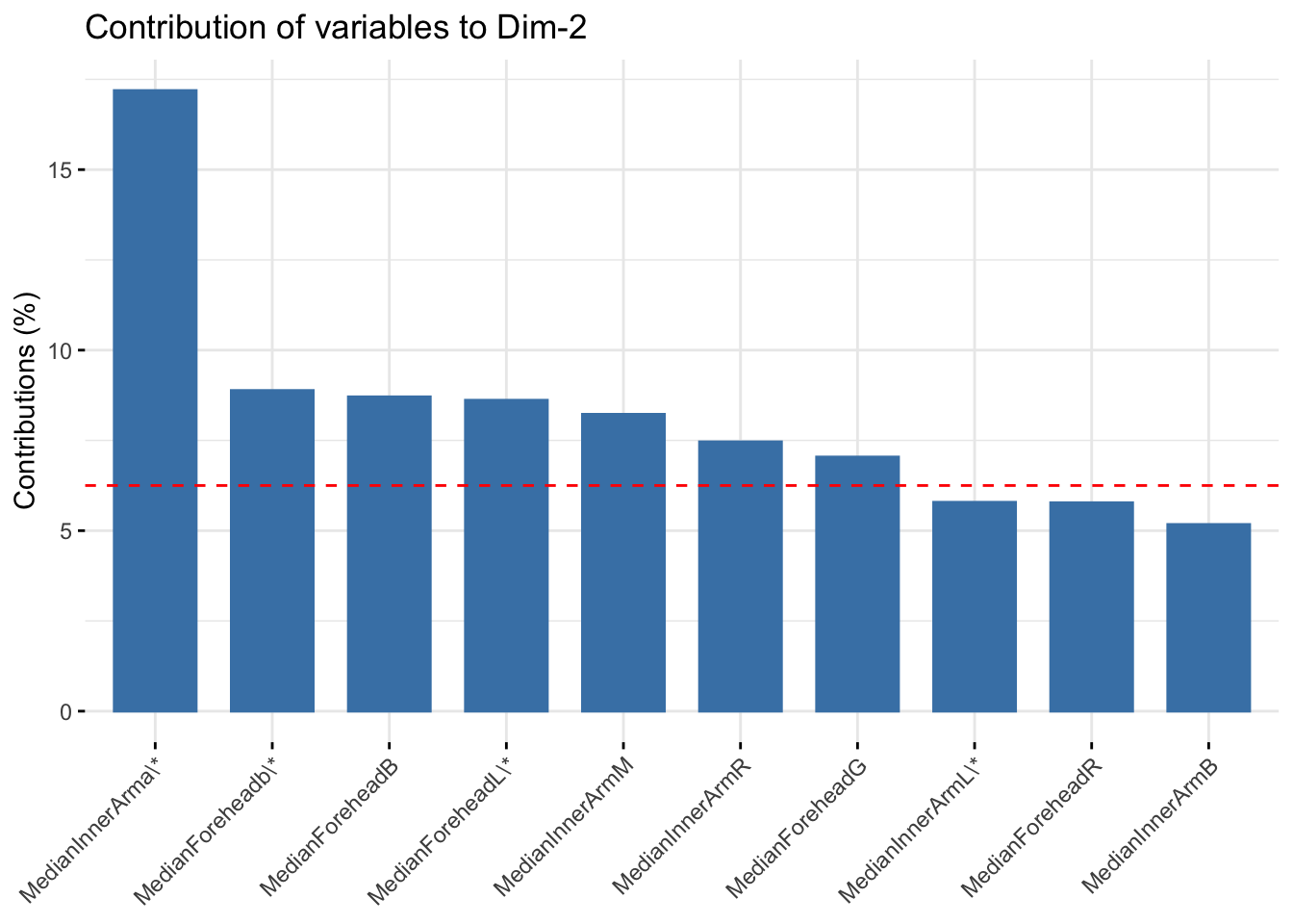 fviz_contrib(six_cie_pca, choice = "var", axes = 2, top = 10)