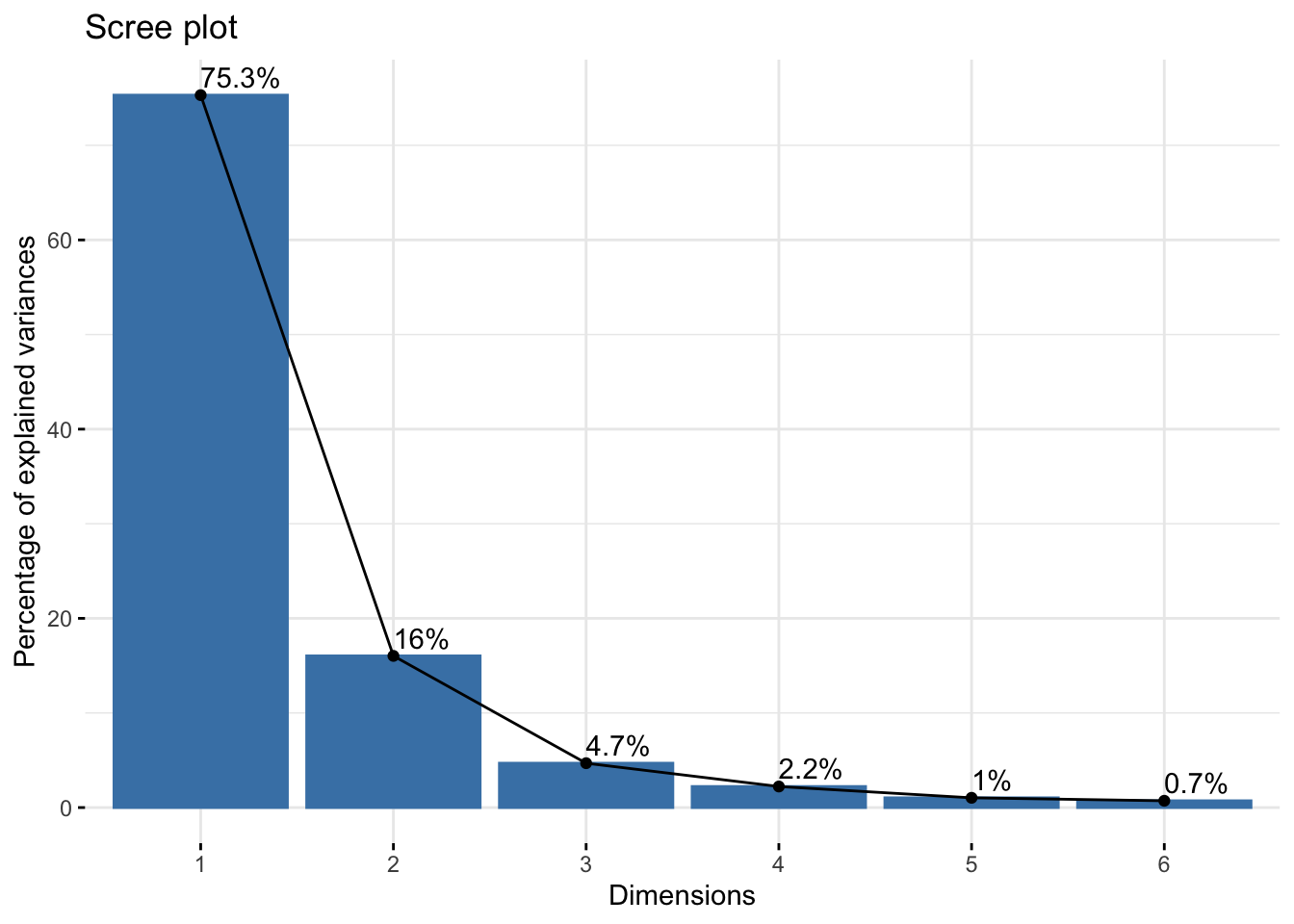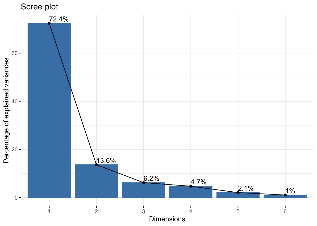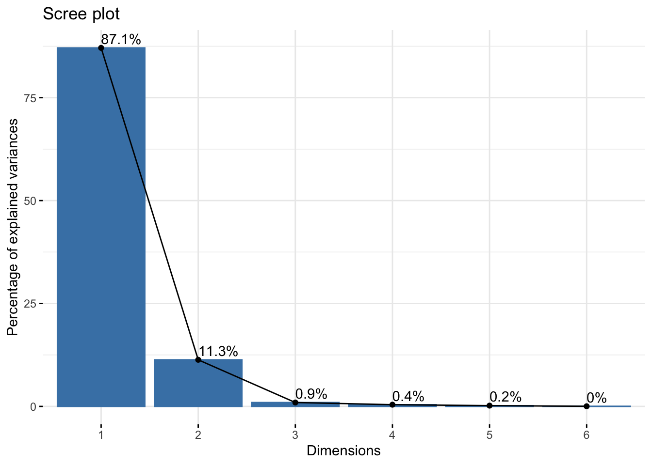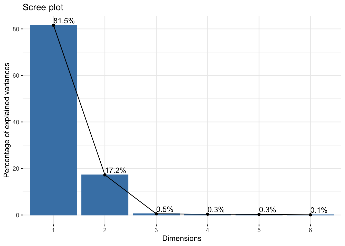 fviz_eig(six_cie_pca, addlabels = TRUE)