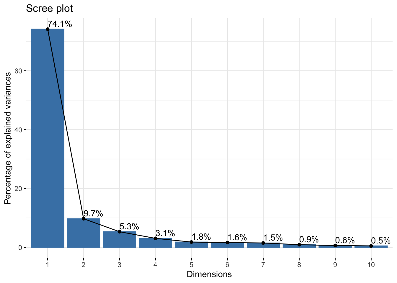 fviz_eig(winter_cie_pca, addlabels = TRUE)