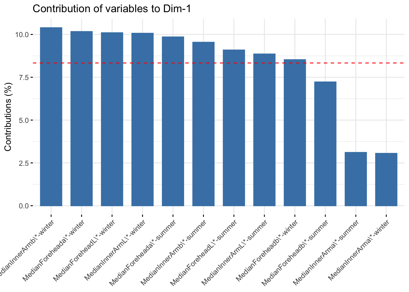 fviz_contrib(winter_cie_pca, choice = "var", axes = 1, top = 10)