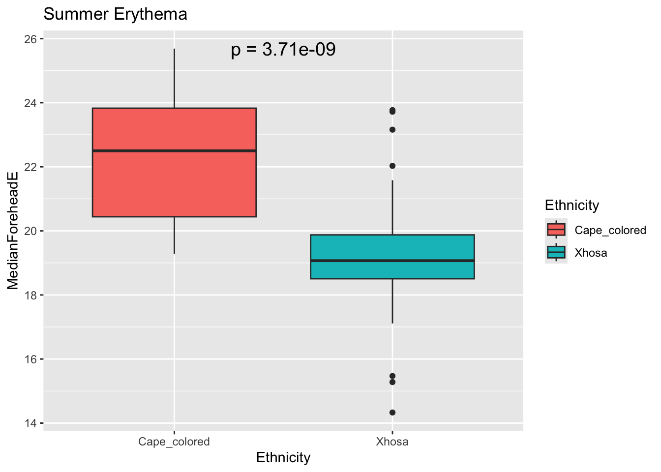 Eresult <- t.test(MedianForeheadE ~ Ethnicity, data = summer_data)