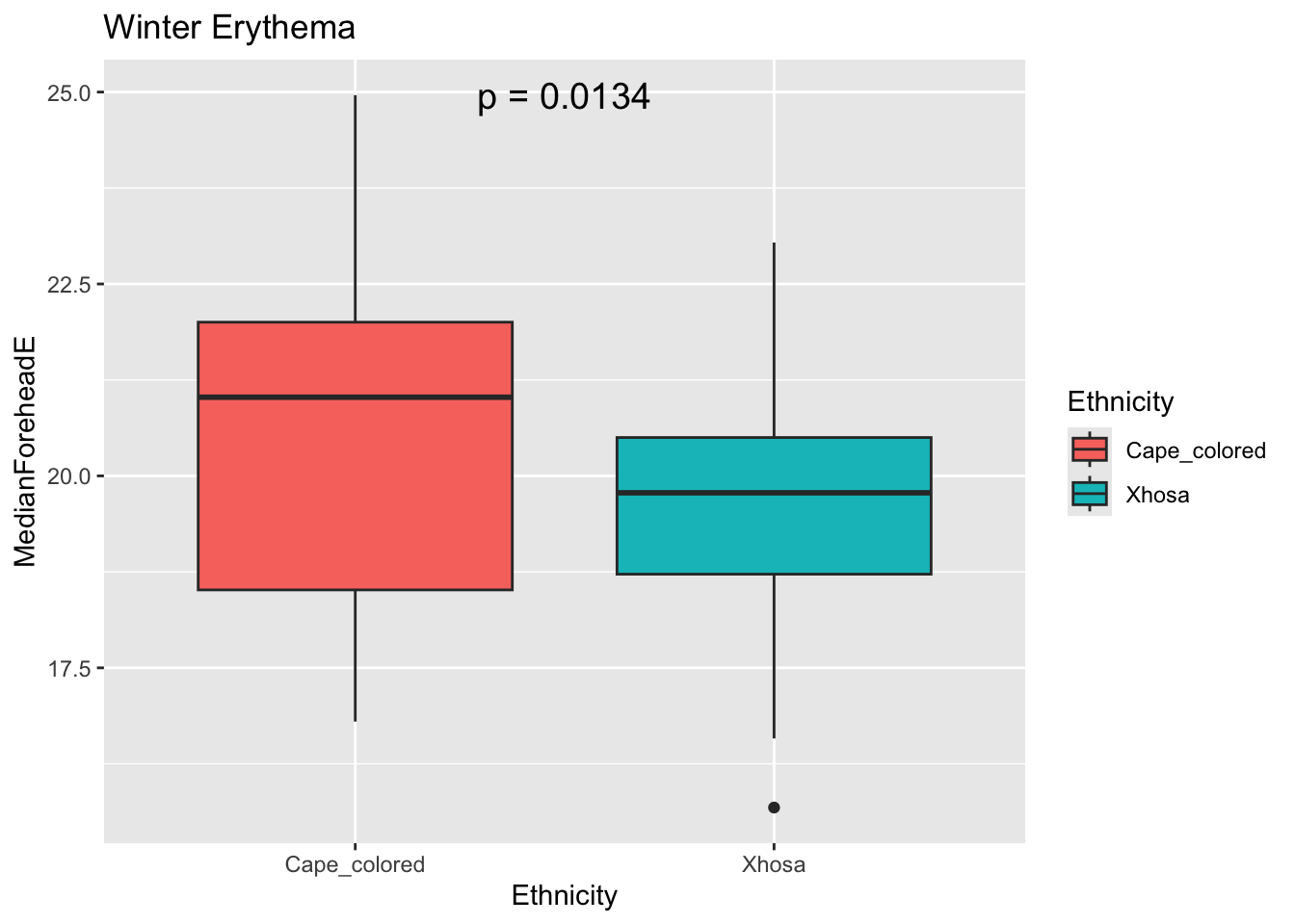 Eresult <- t.test(MedianForeheadE ~ Ethnicity, data = winter_data)