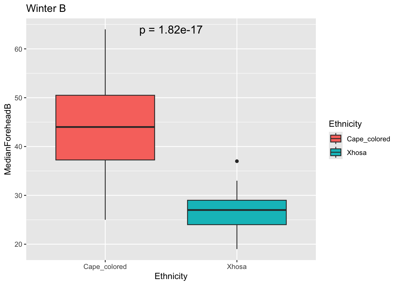 winterB <- t.test(MedianForeheadB ~ Ethnicity, data = winter_data)
